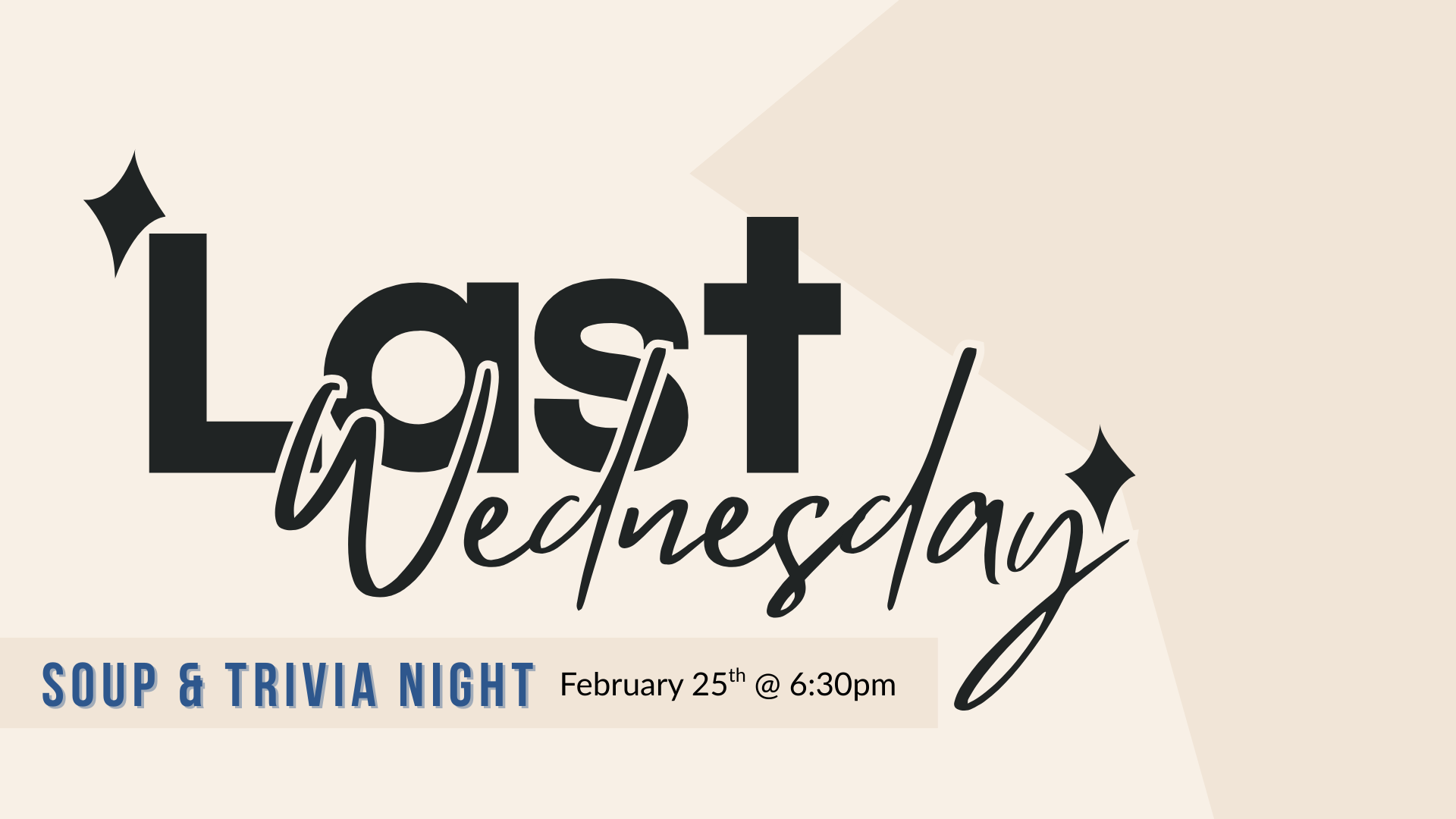 The last Wednesday of each month, we set aside time to gather together as one church family. That means our Community Groups will not meet this week so everyone can participate!